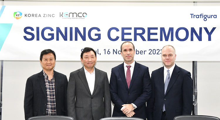 Signing ceremony attended by Ki Deok Park, President of Korea Zinc, and Choi James Soung, President/CEO of KEMCO, and Gonzalo De Olazaval, Global Head of Metals and Minerals for Trafigura, and Daniel Von Arx, Global Head of Battery Metals for Trafigura.